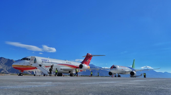 2024年9月19日,中國(guó)商飛公司一架C919飛機(jī)從四川成都雙流國(guó)際機(jī)場(chǎng)起飛,經(jīng)過2小時(shí)8分鐘飛行,平穩(wěn)降落在西藏拉薩貢嘎國(guó)際機(jī)場(chǎng)。這是C919飛機(jī)首次飛抵拉薩,與正在進(jìn)行演示飛行的ARJ21飛機(jī)相聚在“世界屋脊”青藏高原。