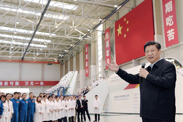 習(xí)近平總書記于2014年5月23日親臨中國(guó)商飛公司考察并發(fā)表重要講話,多次對(duì)中國(guó)商飛公司發(fā)展建設(shè)和項(xiàng)目研制作出重要指示,為大飛機(jī)事業(yè)發(fā)展提供了科學(xué)指南、根本遵循和強(qiáng)大動(dòng)力。他強(qiáng)調(diào),研制大飛機(jī)承載著幾代中國(guó)人的夢(mèng)想,搞大飛機(jī)和我們“兩個(gè)一百年”的目標(biāo)、實(shí)現(xiàn)中國(guó)夢(mèng)的目標(biāo)是一致的。要做一個(gè)強(qiáng)國(guó),一定要把我們自己的裝備制造業(yè)搞上去,一定要把大飛機(jī)搞上去。(摘自新華社文章)